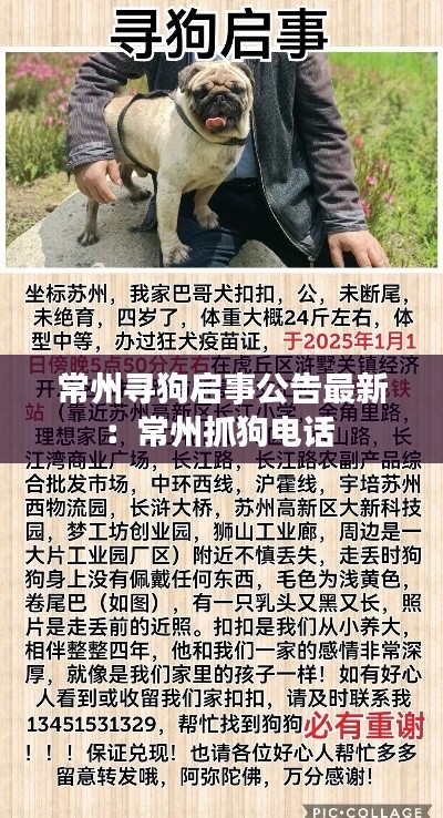 尊敬的市民朋友们,大家好!近期,我们收到了关于常州地区走失狗狗的求助信息,为了帮助失主尽快找回心爱的宠物,我们特此发布最新寻狗启事公告。以下是我们收集到的最新信息,敬请广大朋友们关注并帮忙转发,共同助力寻狗行动。
