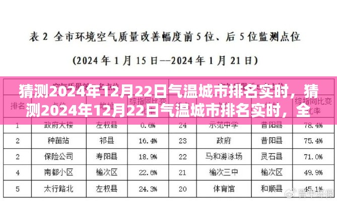 摘要:本文将实时猜测2024年12月22日的气温城市排名,并对其进行全面评测与深度介绍。通过分析气象数据和历史气候记录,预测不同城市的气温变化趋势,包括最高气温、最低气温和平均气温等。本文还将探讨气候变化对城市环境的影响,以及不同城市在应对气候变化方面的措施和策略。通过本文,读者可以了解未来某一天不同城市的气温状况,为出行、生活和工作提供参考。