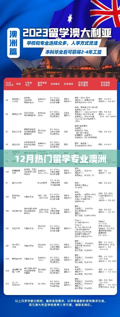 在12月,商科、工程、信息技术、医学与健康、艺术与设计、法律、教育和环境科学与社会可持续发展等专业依然是澳洲的热门留学专业,这些专业不仅就业前景广阔,还能帮助学生建立国际化的视野和专业技能,对于计划前往澳洲留学的学子来说,选择这些热门专业是一个不错的选择,在选择专业时,还应根据自己的兴趣和职业规划进行综合考虑,选择最适合自己的专业。