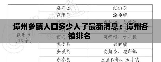 随着我国经济社会的发展,人口分布也在不断变化。漳州作为福建省的一个历史文化名城,近年来,其乡镇人口数量的变化一直是社会各界关注的焦点。本文将为大家带来漳州乡镇人口数量的最新消息,带您了解这一地区的 人口现状。