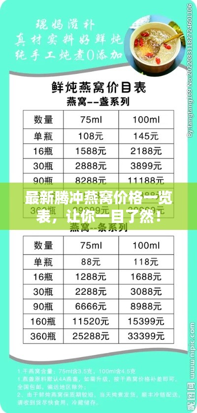 了解腾冲燕窝的最新价格查询表有助于消费者更好地把握市场动态,做出明智的消费选择,在选购燕窝时,消费者应注意品质、等级、产地等因素,选择正规渠道购买,以确保购买到优质的产品,理性消费,避免盲目跟风,根据自身需求选择合适的燕窝产品。
