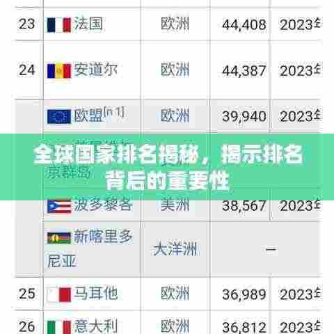 世界国家排名的重要性不容忽视,它不仅反映了各国在经济、政治、科技、文化等多方面的综合实力,也是各国国际地位和国际影响力的直接体现,各国都应重视在世界国家排名中的表现,努力提升自身实力,为全球的和平与发展作出贡献。