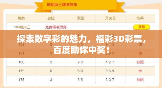 随着科技的进步和社会的发展,互联网已经渗透到我们生活的方方面面,在这个数字化时代,越来越多的人选择通过互联网来参与彩票投注,享受那份期待与惊喜,我们就来一起探讨一下关于“彩票福彩3D”的相关内容,通过“百度一下”来揭开数字彩的神秘面纱。