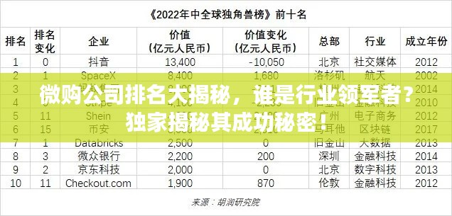 随着电子商务的飞速发展,微购作为一种新兴的购物模式,逐渐受到广大消费者的青睐,本文将根据市场表现、业绩、品牌影响力等多个维度,对当前的微购公司进行综合排名,揭示行业领军者的成功秘诀。